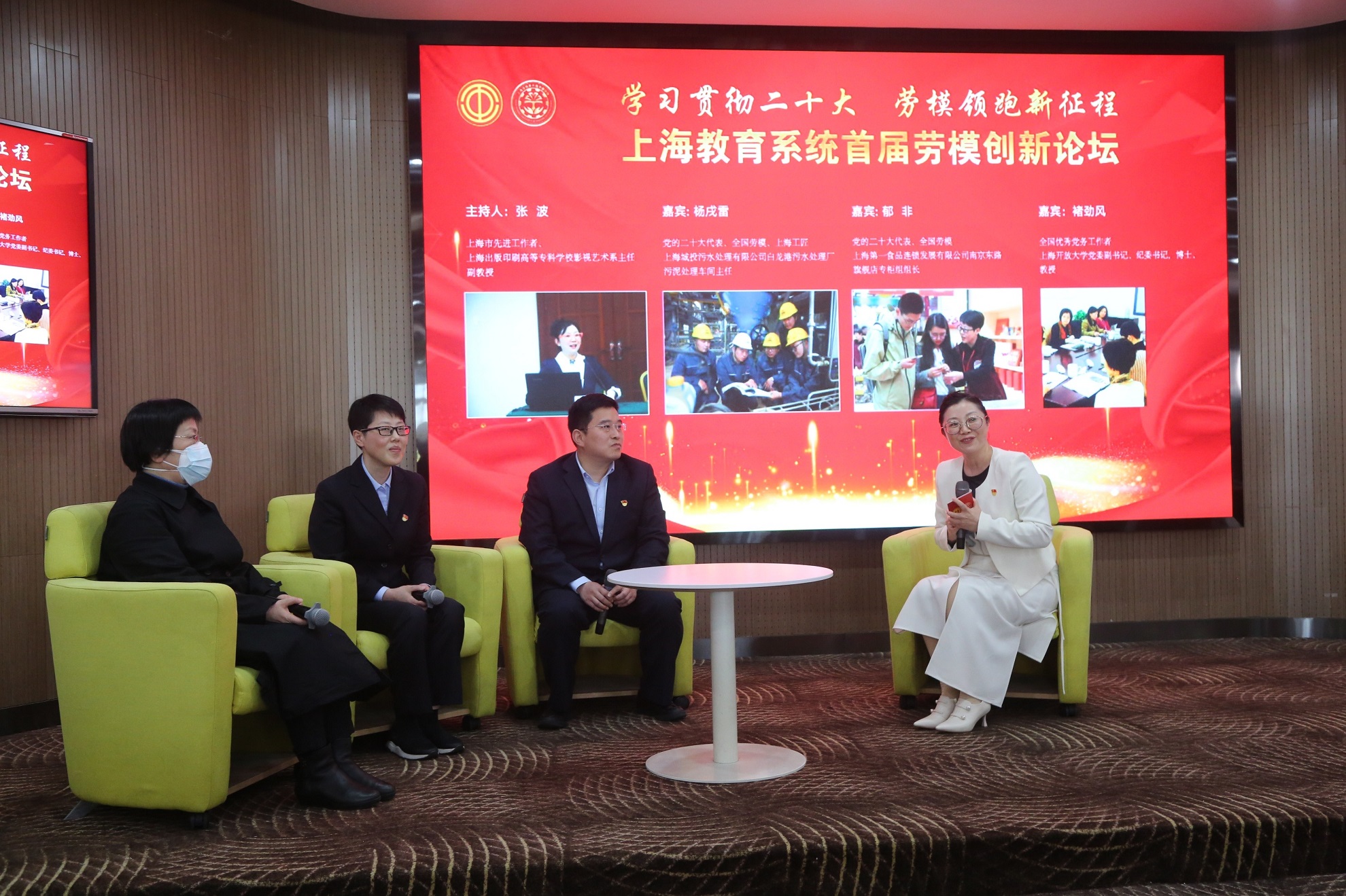 在劳模微论坛环节,党的二十大代表、全国劳模、上海工匠、上海城投污水处理有限公司白龙港污水处理厂污泥处理车间主任杨戌雷,党的二十大代表、全国劳模、上海第一食品连锁发展有限公司南京东路旗舰店专柜组组长郁非,全国优秀党务工作者、上海开放大学党委副书记、纪委书记褚劲风教授作为特邀嘉宾,与主持人、上海市先进工作者、上海出版印刷高等专科学校影视艺术系主任张波一起,共话劳模创新和劳模精神、工匠精神的传承发扬。