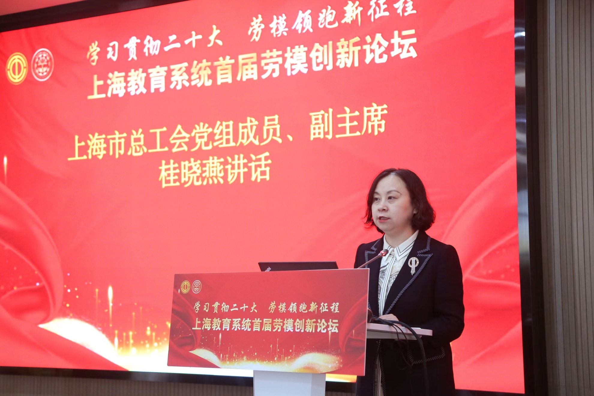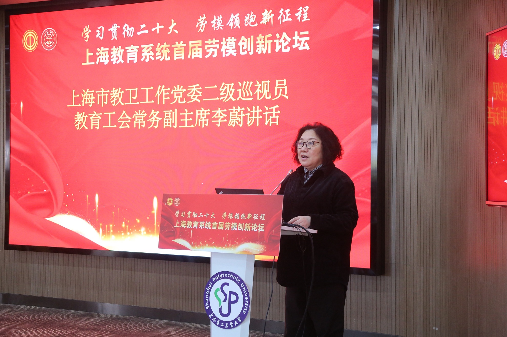论坛由上海市总工会、上海市教卫工作党委指导,中国教育工会上海市委员会主办,中国教育工会上海第二工业大学委员会、上海市教育系统劳动模范协会承办,上海市劳模文化研究中心协办。市总工会副主席桂晓燕,市教卫工作党委二级巡视员、教育工会常务副主席李蔚出席并讲话,上海第二工业大学党委书记吴松致欢迎词,30多位上海教育系统“劳模创新工作室”的劳模代表以及各高校工会、各区教育工会(含中职联)、机关直属单位工会负责人等出席论坛。论坛以线上线下相结合的方式举行,上海教育系统工会干部在线参加。