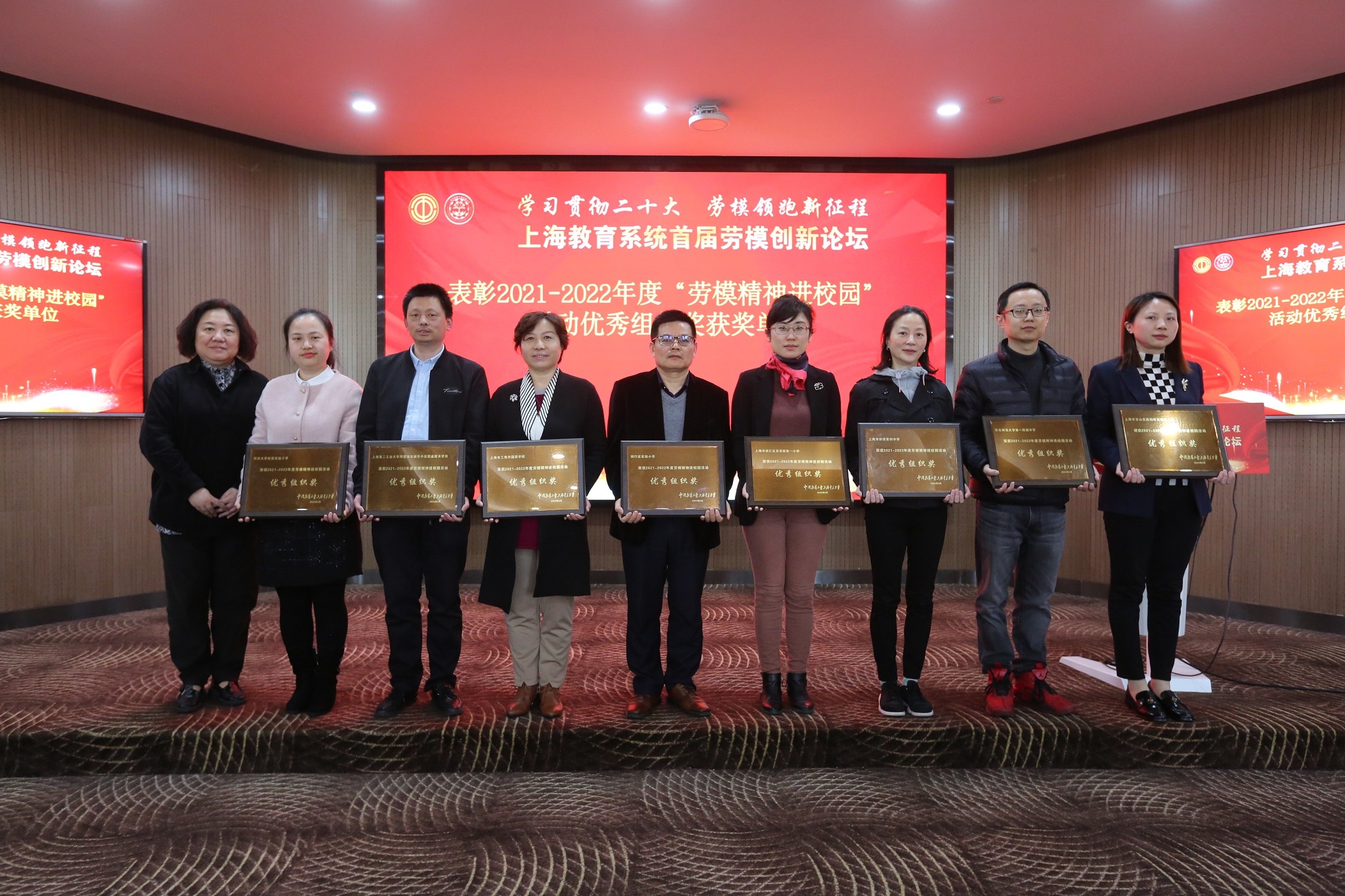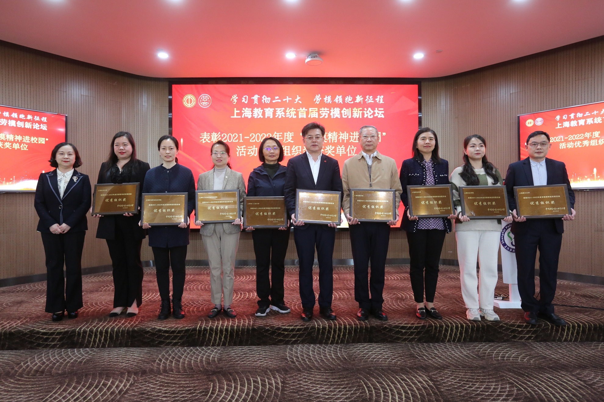 会议表彰了2021-2022年度“劳模精神进校园”活动优秀组织奖单位并颁发了奖牌。上海交通大学、华东理工大学、上海第二工业大学、上海杉达学院、上海甘泉外国语中学、同济大学附属实验小学等40家单位获得殊荣。