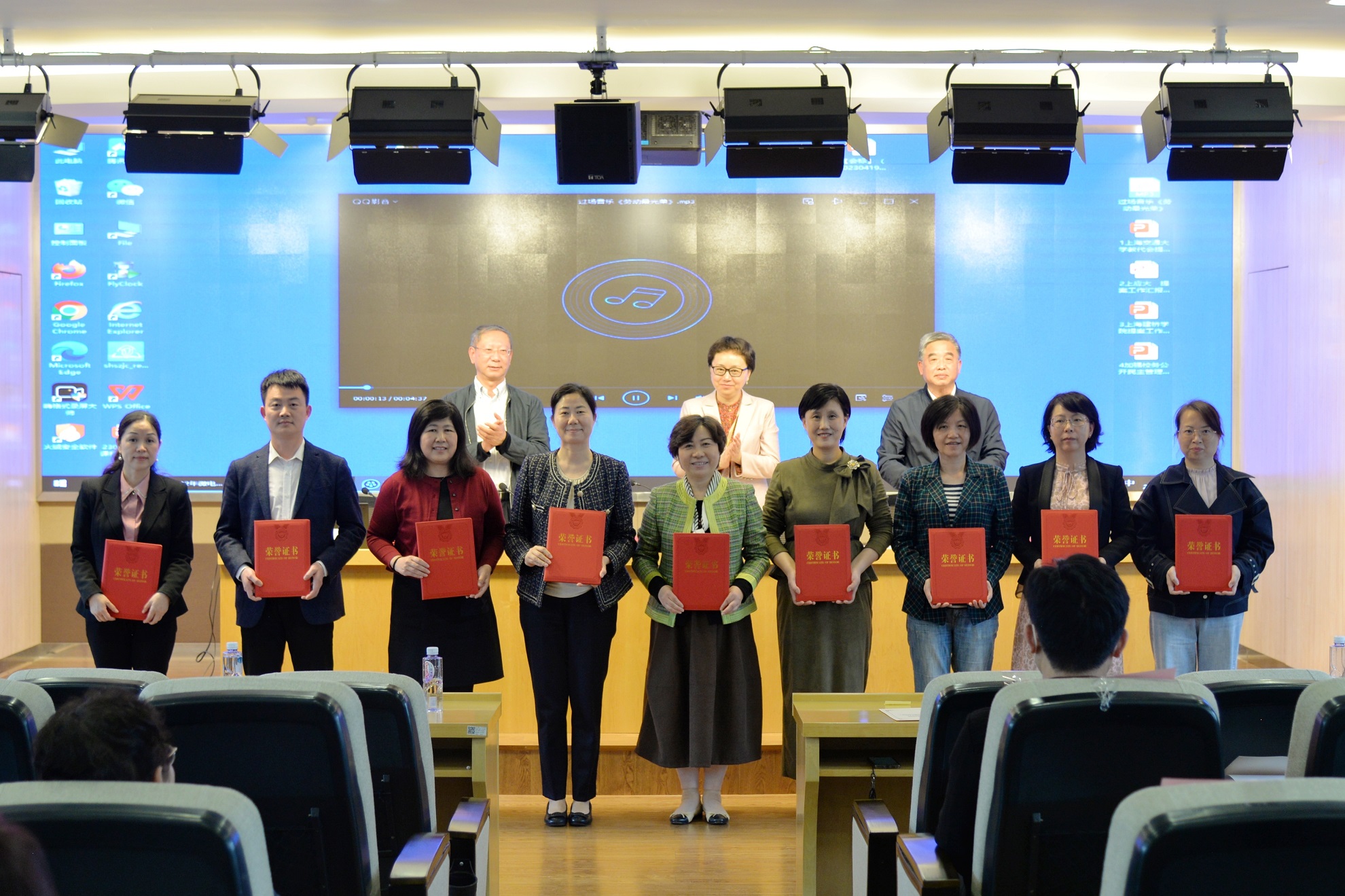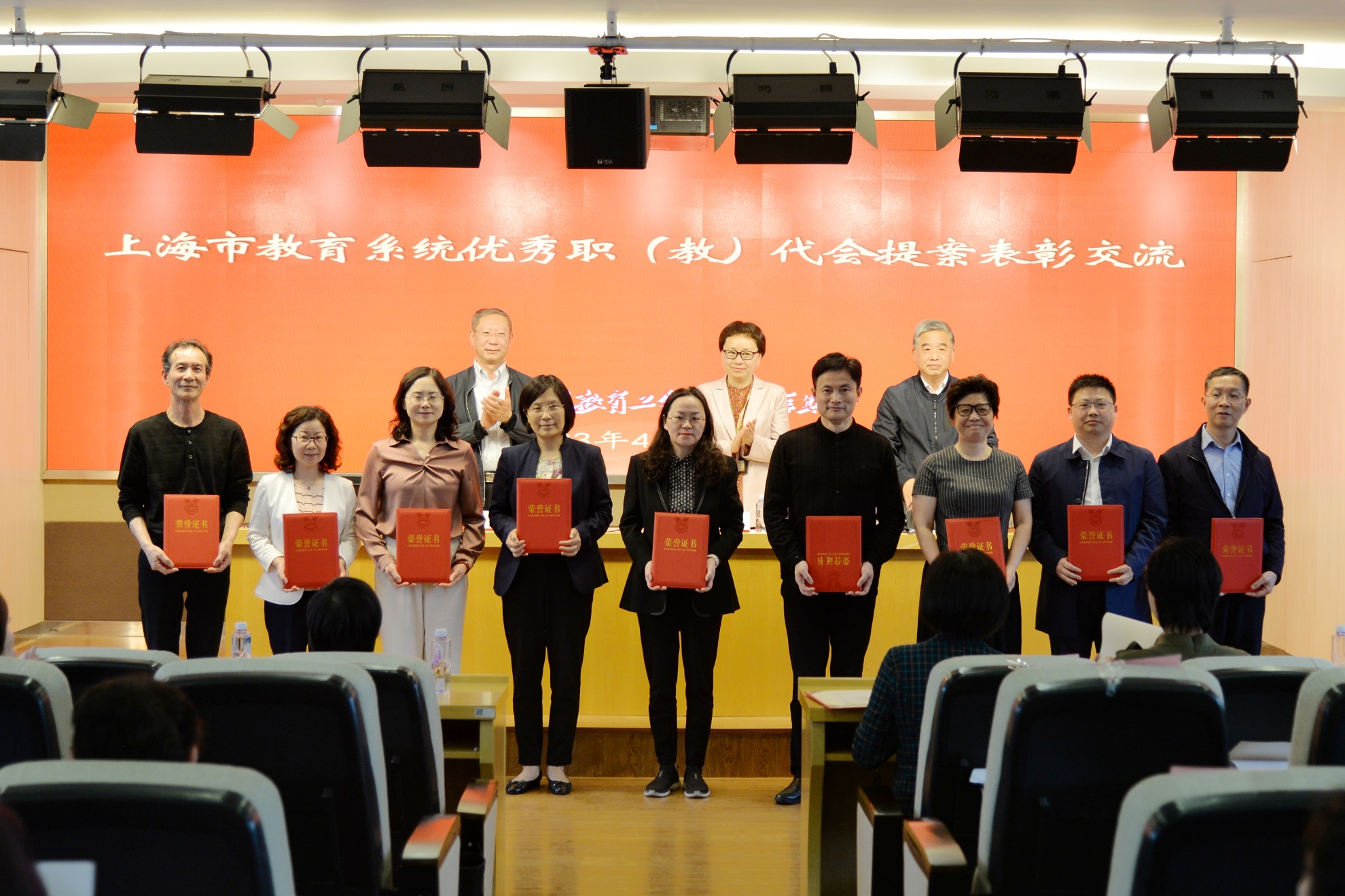 上海市教育工会会员代表会议上,表彰了上海市教育系统优秀职(教)代会提案,并为部分获奖单位代表颁发证书。上海交通大学工会副主席郭俊华、上海应用技术大学工会常务副主席张淑梅、上海建桥学院工会主席夏雨、长宁区教育工会副主席刘青芳,作为基层工会获奖代表交流发言。