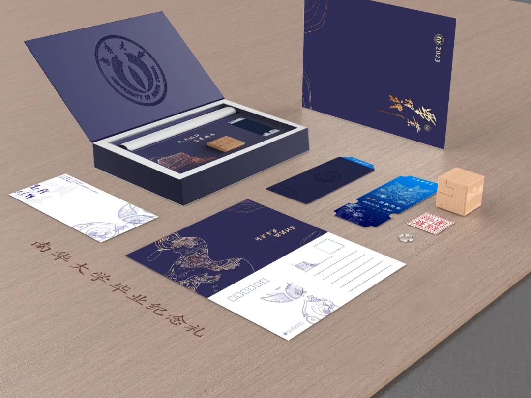 南华大学送给毕业生的礼盒形似一本合上的书,以南华蓝为底色,镌刻以烫金文字和线条,辅以浅色腰封,典雅庄重又不失美感。礼盒里有印章、纪念币/戒指等。币中央小巧的指环镌刻着毕业年月,印章采用子母印的设计,代表着学校永远与毕业生们同在。