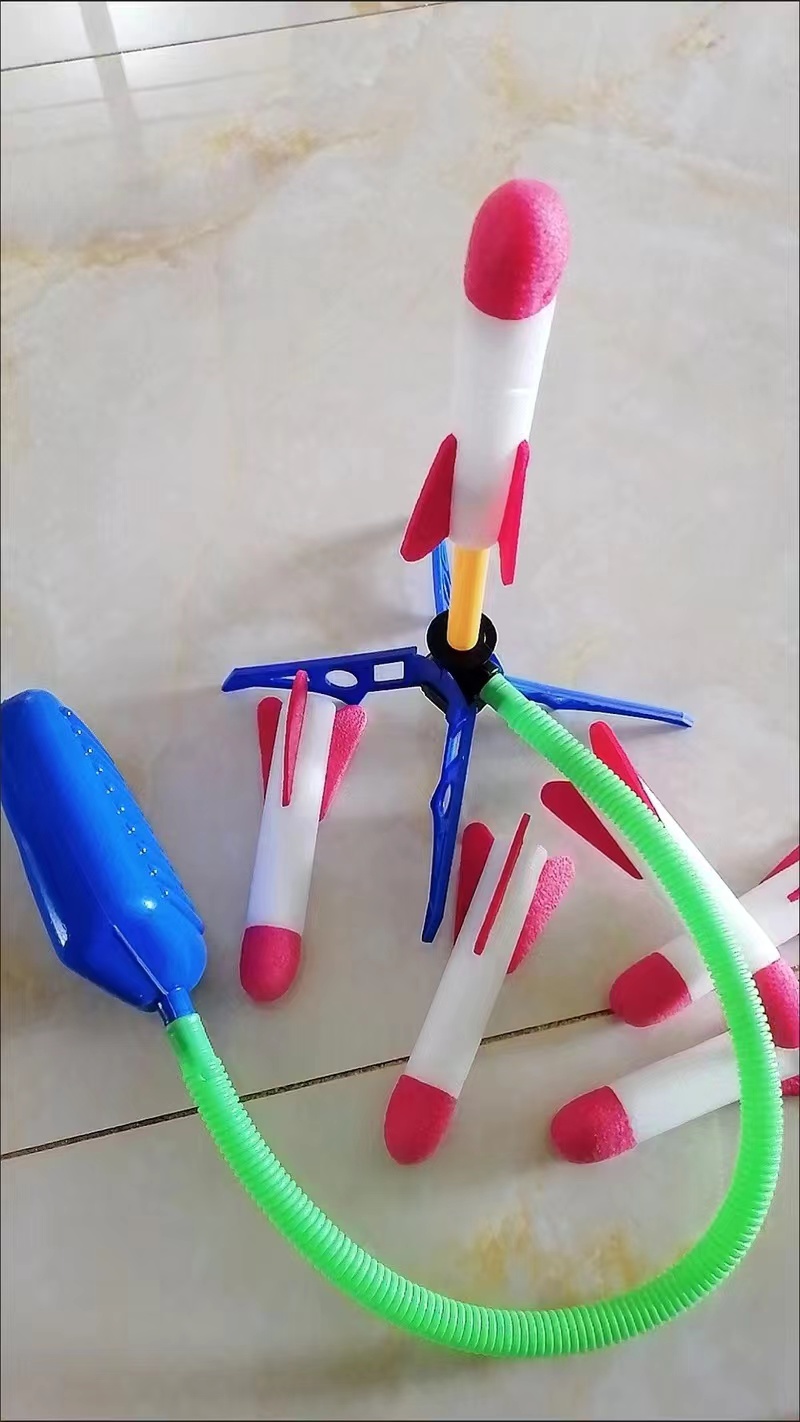冲天火箭的玩法挺简单,把火箭筒插好,蹦跳着踩上气囊,火箭就“咻”地发射出去了。