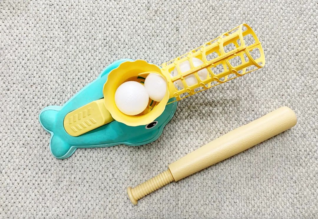 这个棒球发球机特别有意思,脚踩之后5秒左右,球自动弹出,速度不快,但要击中也挺考验手眼协调的。