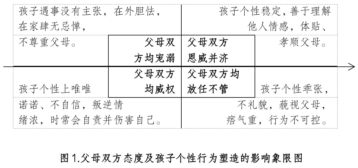的确,父母双方的教育各有意义,双方在教育理念和方向上要保持一致,扮演的角色要有所不同,就如小学课文中的《精彩极了与糟糕透了》的母与父,让孩子总是要在激励和鞭策中保持着积极向上的情绪和冷静严谨的态度,成为一个完整的人。(父母教育态度对孩子个性影响,见图1)