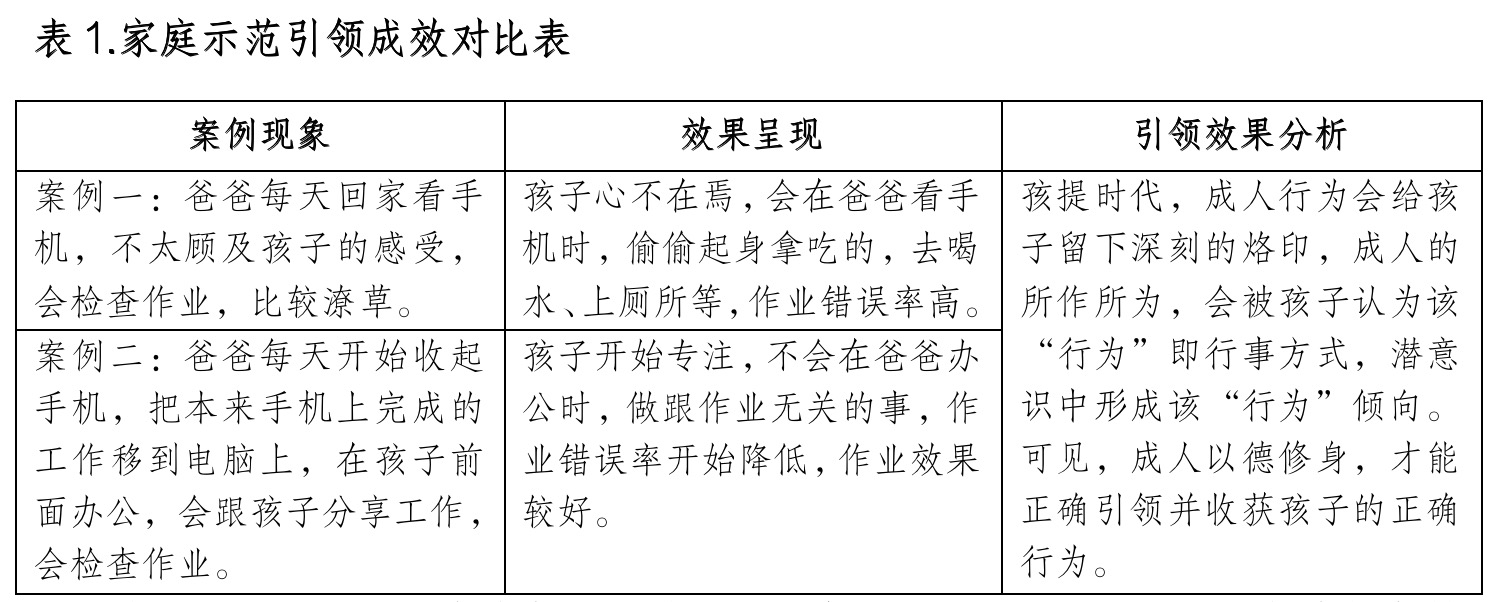 其次,是注重“潜移默化”的影响力,比如想让孩子爱上学习,家长需要引领阅读和学习,让孩子感受到“爸妈很爱学习”;让孩子不玩手机,家长在家里需要把自己手机放一边(见表1)。