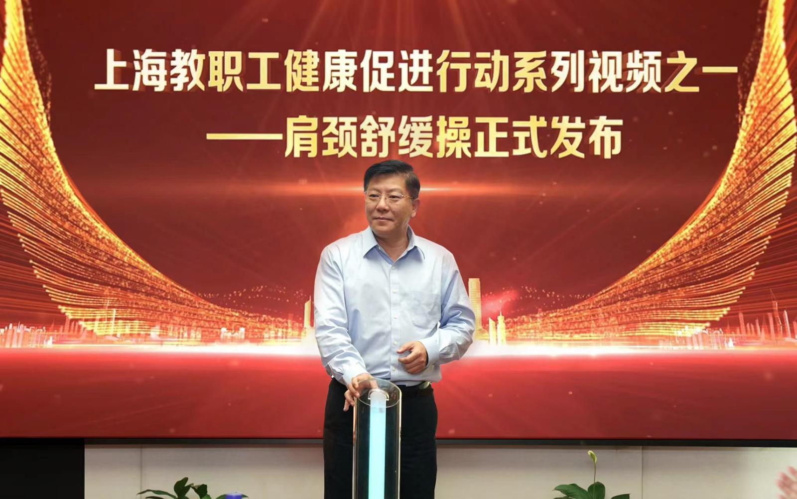 针对教职工群体普遍存在的健康问题,活动特邀复旦大学附属中山医院董健教授设计、录制了适用于教职工的肩颈舒缓操。上海市卫生健康委员会党组书记、主任闻大翔现场发布了舒缓操的演示视频。