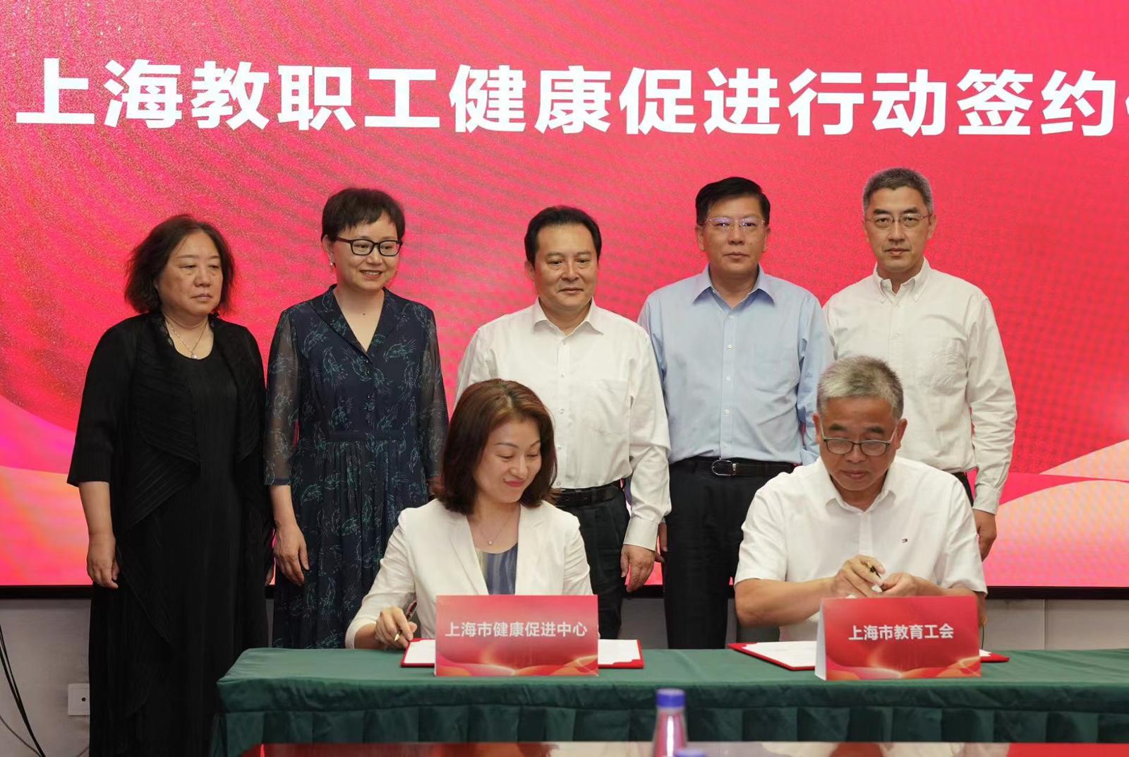 上海市教育工会副主席陶文捷和上海市健康促进中心党委书记唐文娟共同签署上海教职工健康促进行动合作备忘录。