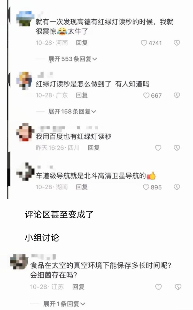 比如,在讲到北斗卫星时,随着北斗卫星状态越来越好,组网越来越完善,导航用到的北斗卫星数量越来越多。打开手机导航,地图甚至可以精确到红绿灯读秒,评论区甚至变成了小组讨论。