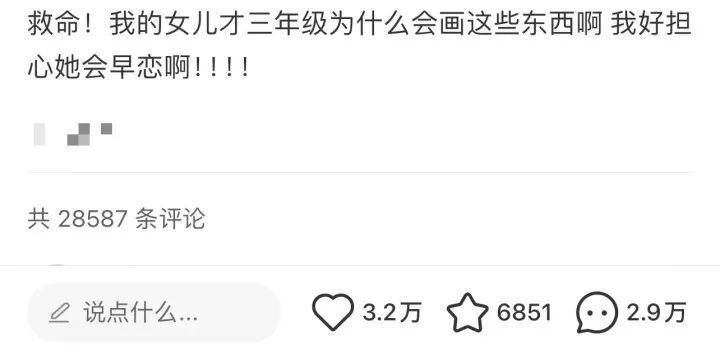 截至发稿时,距离妈妈发出帖子大概过了一周,底下已经有2.9w多条留言,3万多个点赞。一幅画能引发这么多条评论,还是挺让人吃惊的,这也说明,家长们对于这个话题都很关心。有些网友的回复蛮理性,觉得孩子可能就是画着玩。“我小时候也这样,画得比这个还过分。”还有网友说,女孩子正常,她们对两性的关注比较早。“不需要焦虑,我女儿8岁,不久之前才问过我,她说她不想结婚但是想照婚纱照,我就说没关系宝贝,不结婚也可以照的哦。”