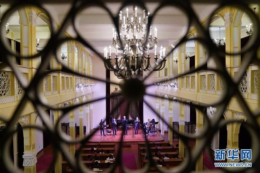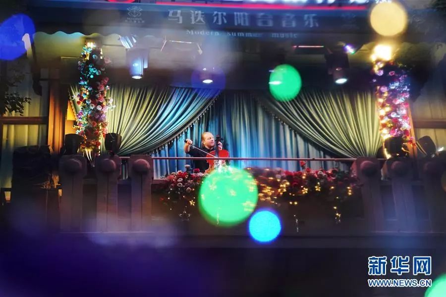 在哈尔滨中央大街,演员在马迭尔阳台音乐会上演奏。新华社记者 王建威 摄