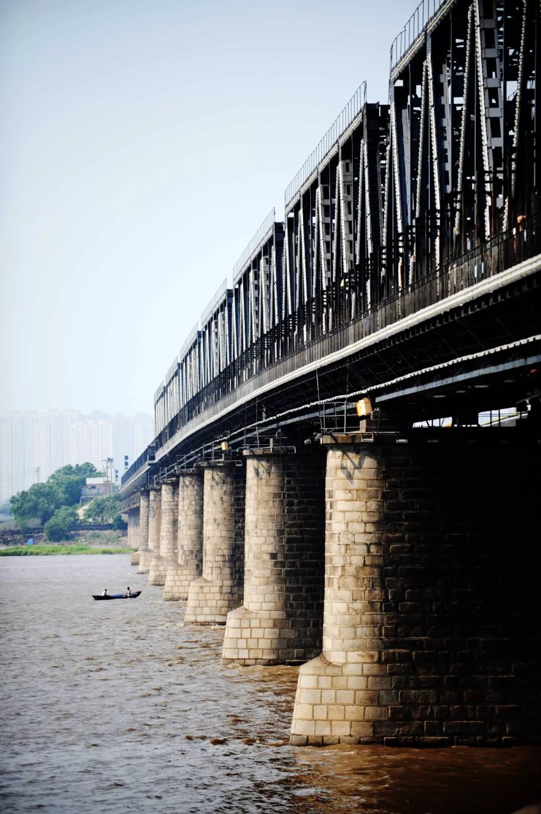 一艘小船从中东铁路桥下通过。新华社记者 王建威 摄