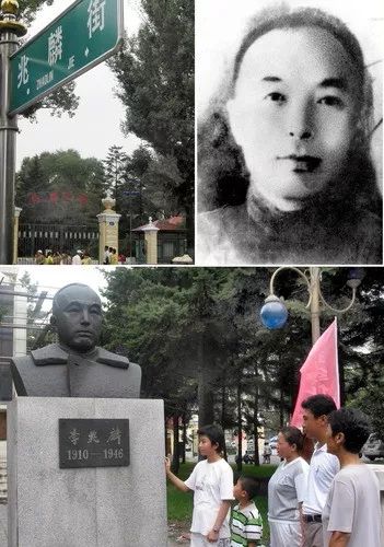 右上图:李兆麟烈士像(资料照片)。左上图:为纪念李兆麟烈士命名的街道——兆麟街。下图:几位市民在哈尔滨李兆麟烈士塑像前缅怀烈士丰功伟绩。新华社记者 摄