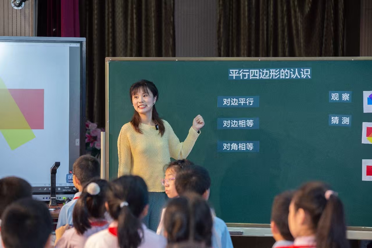 “大家看,如果我们把这两个色带这样交叉重叠……现在它变成了什么图形?”在上海市徐汇区高安路第一小学的教室里,数学老师姚璐俯身在学生课桌前,手持两条彩色色带,指尖灵巧地交错、拉平。孩子们的眼睛亮了起来:“平行四边形!”在姚璐的课堂里,数学不再是书本上冰冷的公式,而是充满了惊奇、猜想与验证的思维之旅。