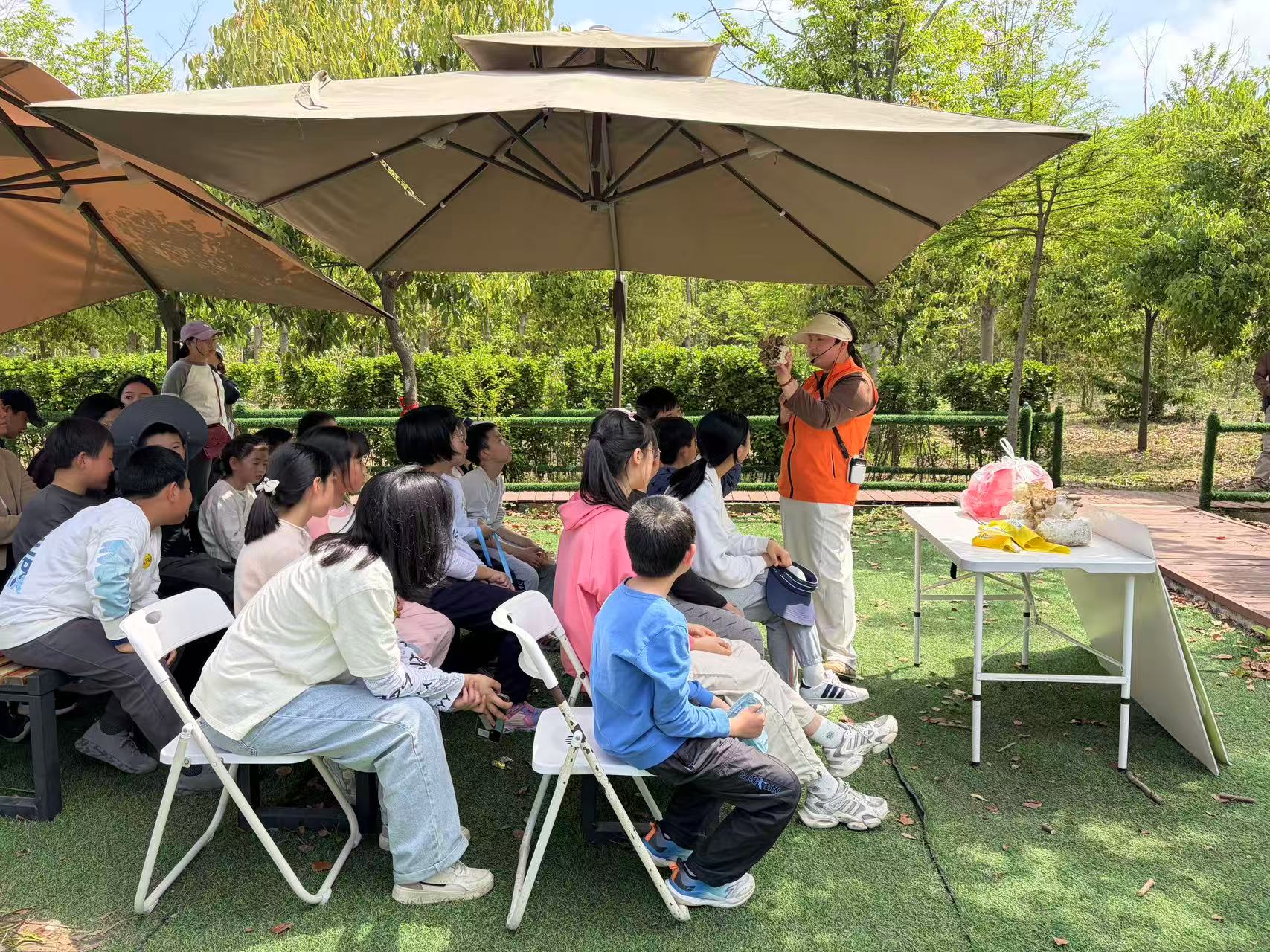活动现场,草木葱茏、溪水潺潺,提供了极佳的体验场景。上午的植树环节,学生和家长分工协作、干劲十足,挖坑、植苗、培土、浇水、挂上亲手绘制的树牌,“小记者”们化身“绿色守护者”,为大地增添新绿。随后的森林亲子律动操,锻炼着大家的协调性,欢乐氛围点燃全场。