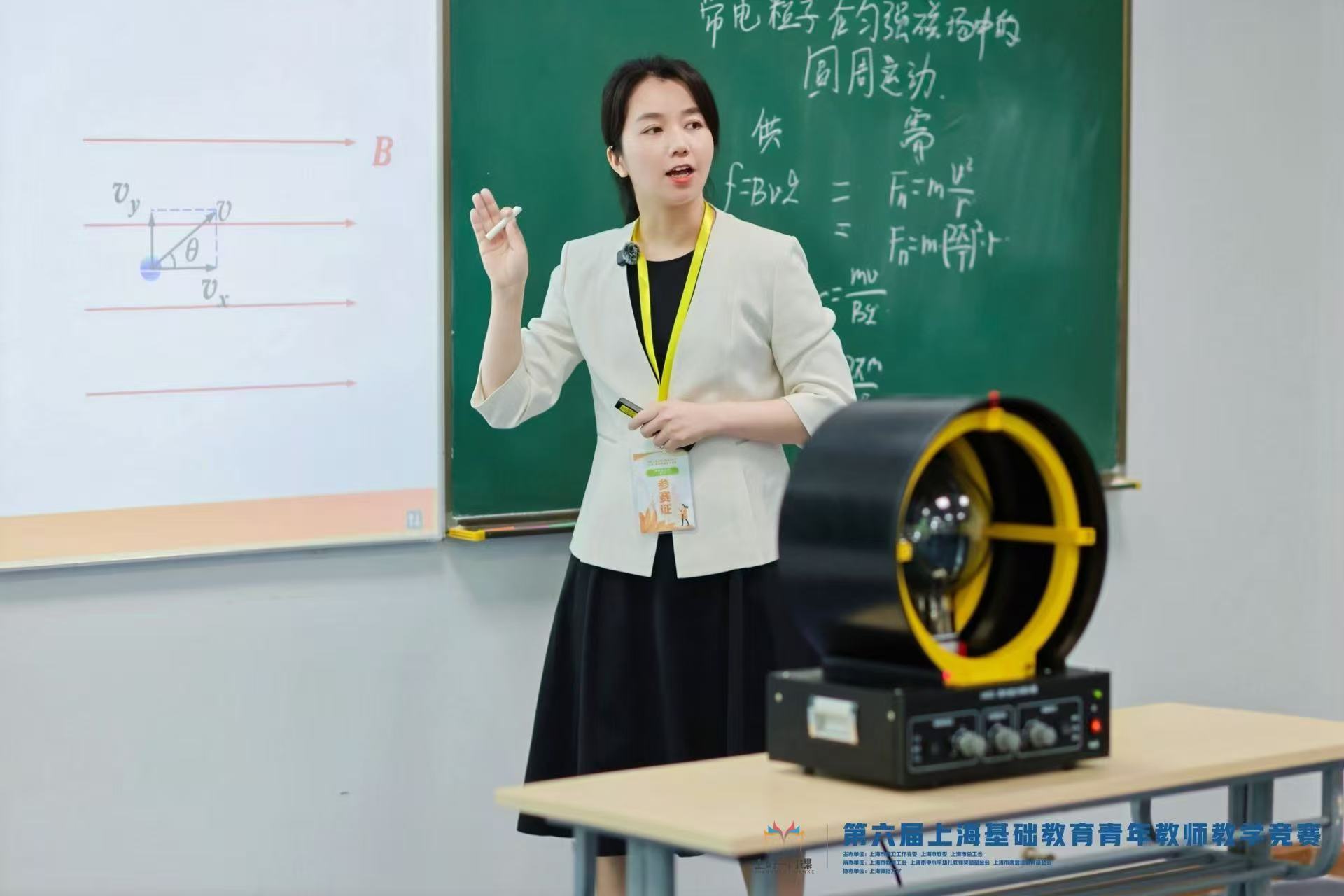于是,陈真真精简实验器材、注重高效实用,最终将20多件教具装满一车带到了赛场,其中六成是她自制、改造的。“上场时抽到‘带电粒子在匀强磁场中的圆周运动’这一课。我以极光作为情境引入,探讨极光呈现不同形态的原因。”随后,她借助洛伦兹力演示仪还原物理原理,“调节加速电压和励磁电流,光圈的大小也在发生变化。犹如极光会呈现圆弧形、螺旋形等不同形态”。“同学们,伸出你们的左手,让磁感线穿过掌心……”当陈真真教学生判断带电粒子运动方向的时候,现场不少评委也跟随讲解,伸出手实践起左手定则。“我很高兴,在无生课堂也实现了互动效果。”