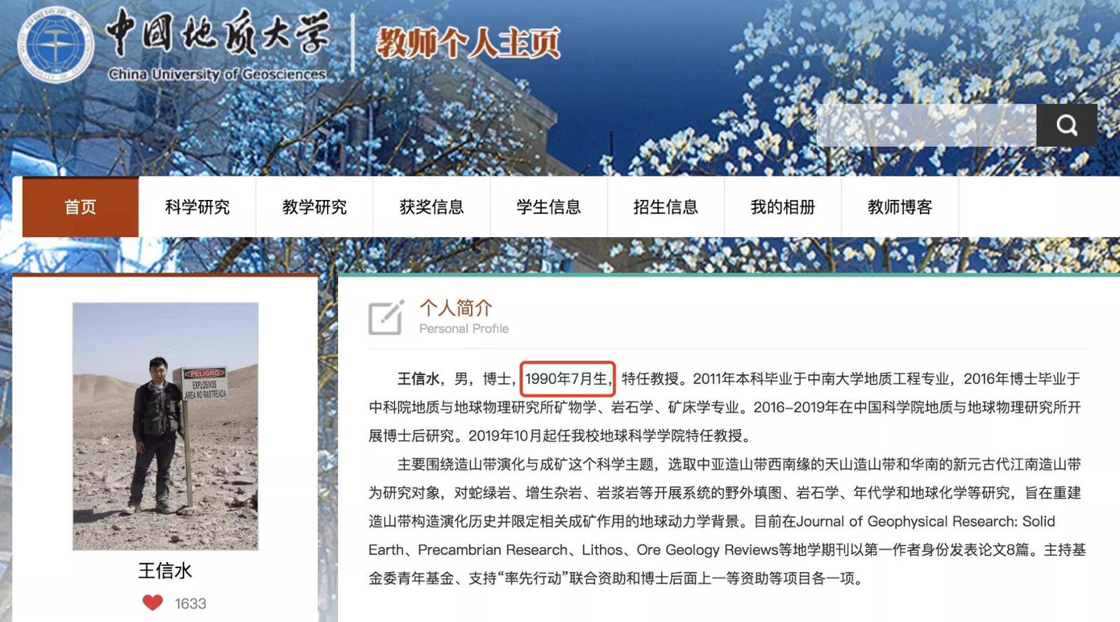 中国地质大学的官网显示,王信水出生于1990年,2019年成为该校特任教授。