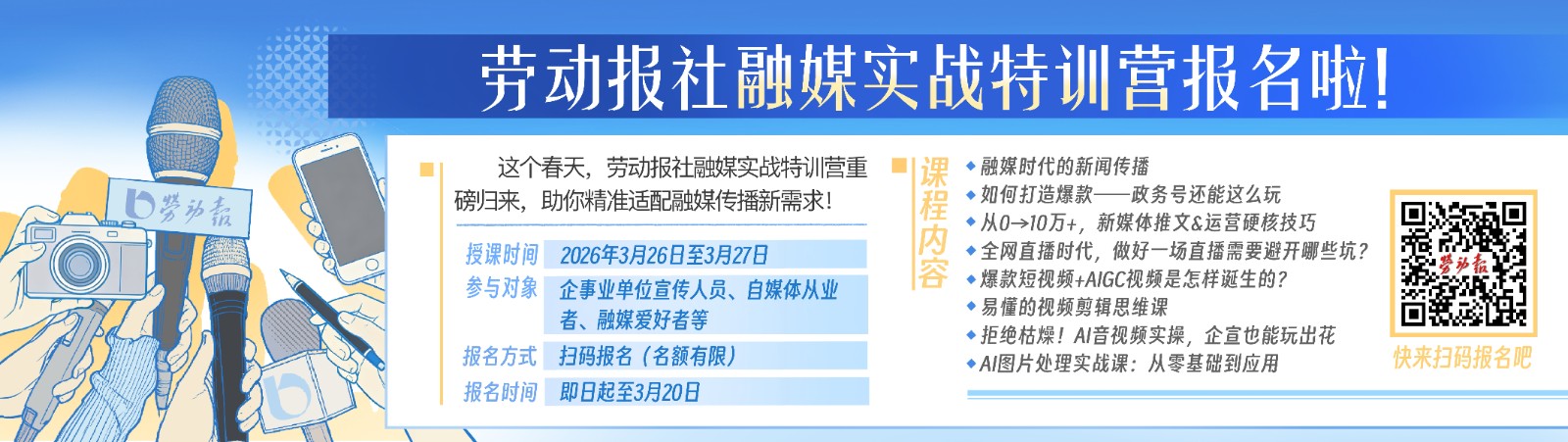 2天时间,解锁融媒全技能,掌握行业前沿运营思路,还有劳动报专业资源加持!赶紧扫码报名,抢占融媒实战提升名额。