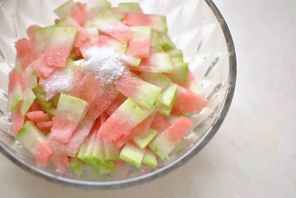 【制法】将西瓜皮刮去蜡质外皮,冬瓜皮刮去绒毛外皮,与黄瓜皮一起,在开水锅内焯一下,待冷切成条状,置盘中,用少许盐、味精匀拌。佐餐食用。