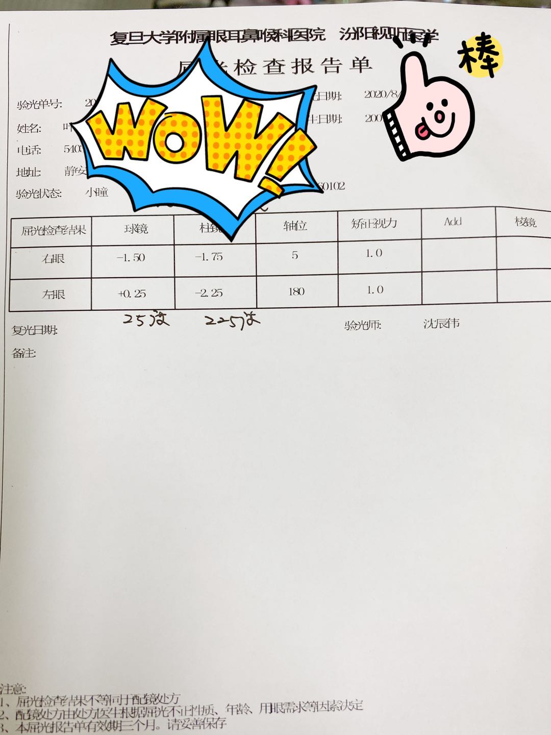 11点半左右,小叶终于被叫进小黑屋,一位男医师熟练地对他进行一番手动插片验光,忙活了10来分钟,验得很仔细,最后交待了一句“散光有点厉害噢!”就不再多话,让他们直接去2楼拿验光单。在急诊楼2楼配镜处,小叶从配镜阿姨手上接过验光单——右眼球镜-1.50,柱镜-1.75;左眼球镜+0.25,柱镜-2.25。这意味着,小叶右眼150度近视,175度散光;左眼25度远视,225度散光。
