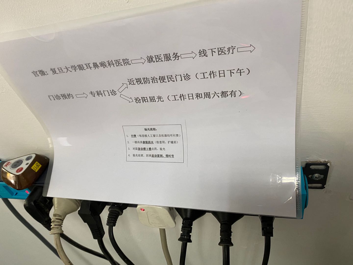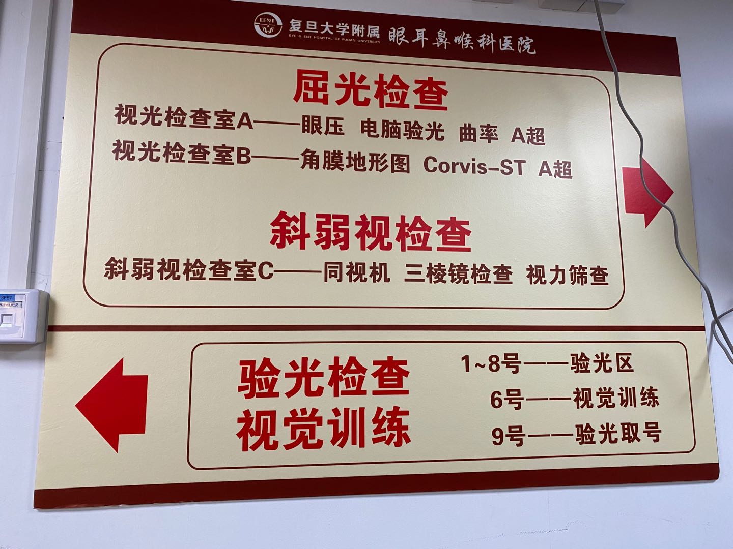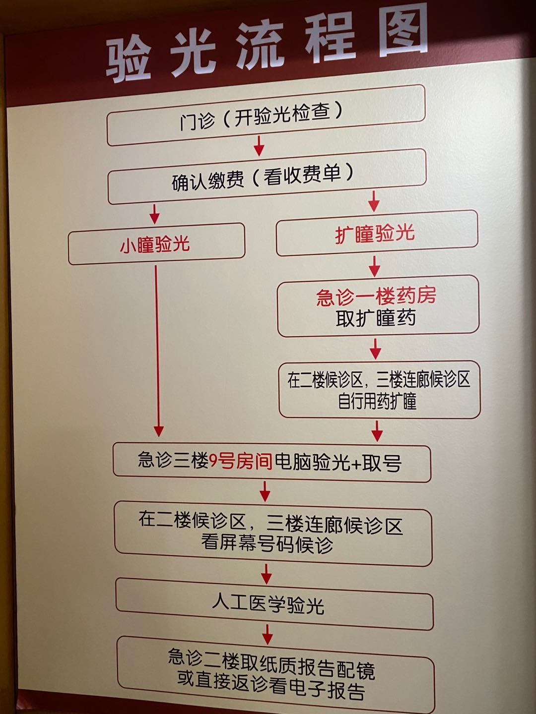 验光流程也一目了然:1、付费(每层楼人工窗口及机器均可付费);2、一楼药房拿眼药水(检查用,扩瞳药);3、对面急诊楼3楼点药水、验光;4、验光结束,再回来返诊签到,等叫号复诊。