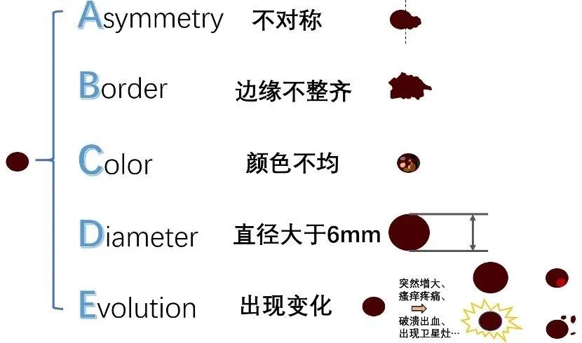 如果出现符合上述“ABCDE”任意一条的“色素痣”,一定要及时去正规医院就诊!