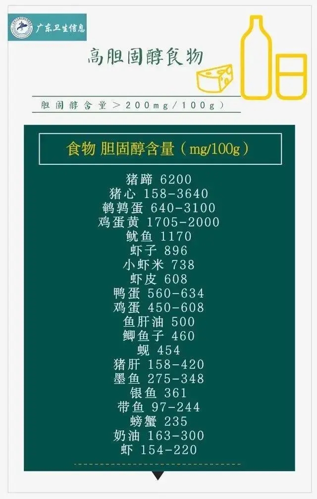 日常生活中,我们要采取健康的生活和饮食方式,预防胆固醇升高。不妨对照下面的食物胆固醇含量表看一下,安排好自己的一日三餐,远离致病元凶。