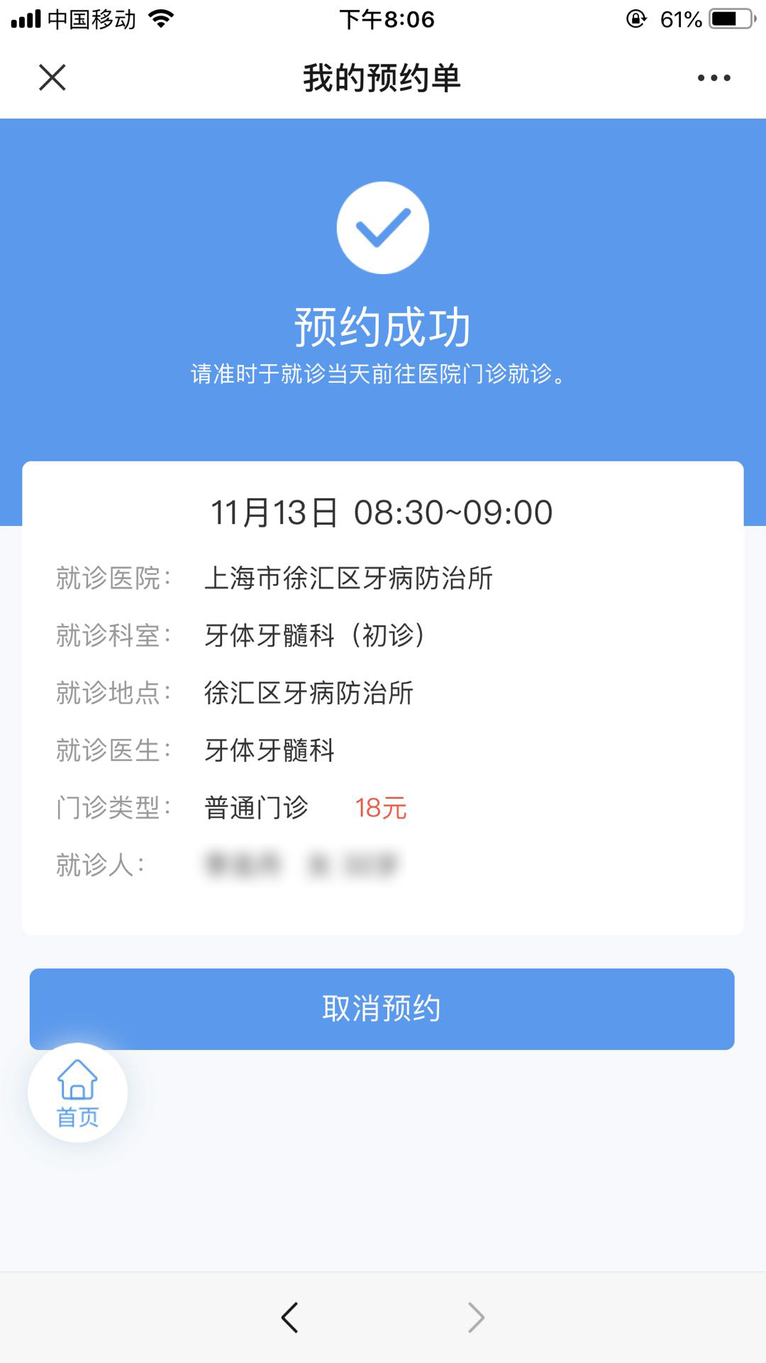 首先是关注了“上海市徐汇区牙病防治所”的公众号,选择好科室即可预约。徐汇区牙防所放号时间是每天晚上八点,可以预约一周内的。刚开始几天由于约得比较晚,基本都约满了。等到周五晚上八点准时到公众号预约,约到了第二周周五早上八点半到九点的号,全程很顺利。