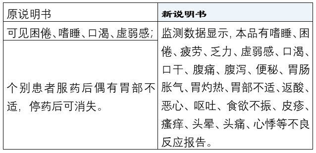 (4)下列安全性数据源自原研药品临床研究:将西替利嗪(3260例)(按推荐剂量服用,10毫克/日)与安慰剂或其他抗组胺药进行比较,观察到下列发生率至少为1%的副作用:嗜睡(9.63%)、头痛(7.42%)、头晕(1.10 %)、咽炎(1.29 %)、口干(2.09 %)等。