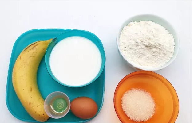 低筋面粉180克、纯牛奶210克、白砂糖(或蜂蜜)25克、鸡蛋1个、植物油10克、香蕉1根、平底锅
