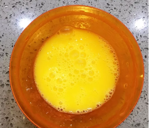 1、鸡蛋加入植物油打均匀。我试着做了两次,如果把鸡蛋多搅拌一会儿,做出来的饼会更松软。
