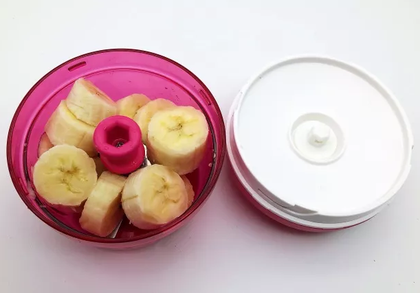 2、香蕉放入搅拌器中打成香蕉泥。放久的香蕉比较软,不一定要用刀切,可以直接用手掰成一小段一小段的,这样会更节省时间。
