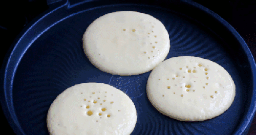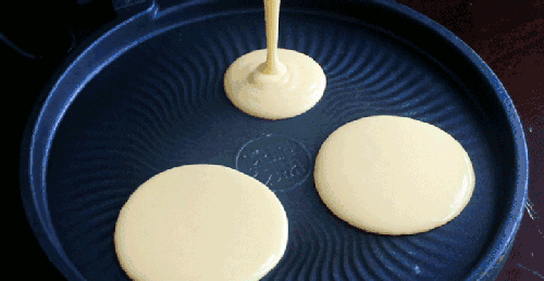 4、平底锅预热后,倒入少许植物油并加热,然后调成小火。直接将液体垂直倒入平底锅,流到平底锅的液体会慢慢形成一个圆形,小饼在烙的过程中,表面会产生小气泡,等到气泡很多的时候就可以翻面了,煎至两面略有焦黄即可。