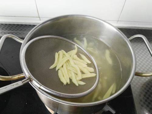 第三步,剪好的面直接下入锅中煮,用勺子搅拌下避免粘连,按照实际的情况,将剪刀面煮熟后,就可以捞出来,过一遍凉开水;