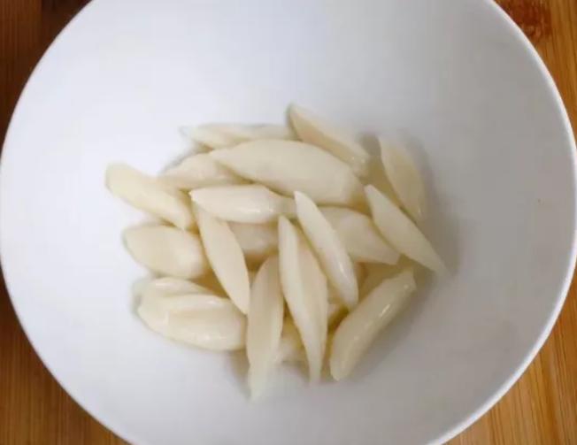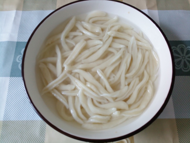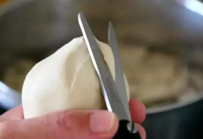 第二步,待将面团醒好后,在锅中添上水,稍微多一点,同时加上点食盐,将水烧开,面团揉捏成椭圆形,用厨房剪刀沿着面团剪出两头尖的细长状鱼形;