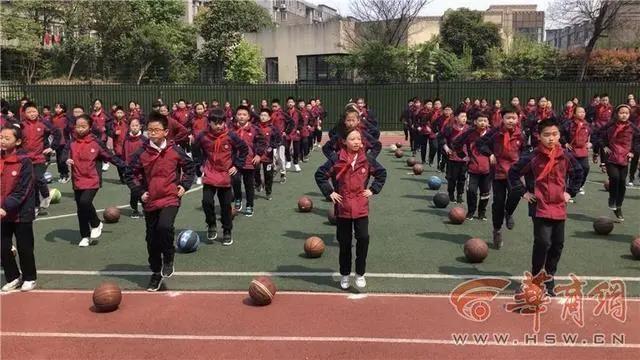 操场上,学生们展示着学校的自编操:篮球操、垃圾分类操、英语操。一旁的羽毛球场地上,有孩子在玩滚铁环、跳房子、跳皮筋,都是“80后”的童年小游戏。