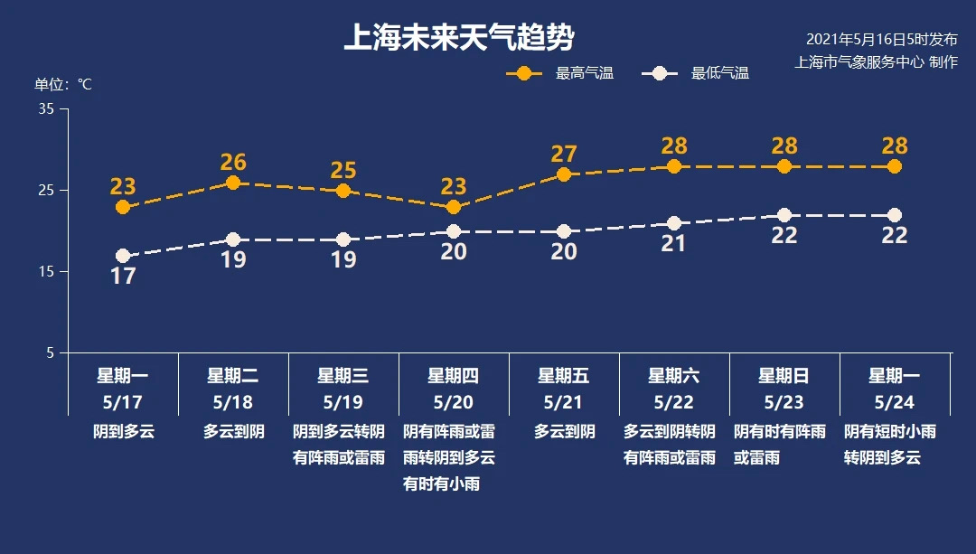 5月22日,周六:阴有阵雨或雷雨 21-28 ℃