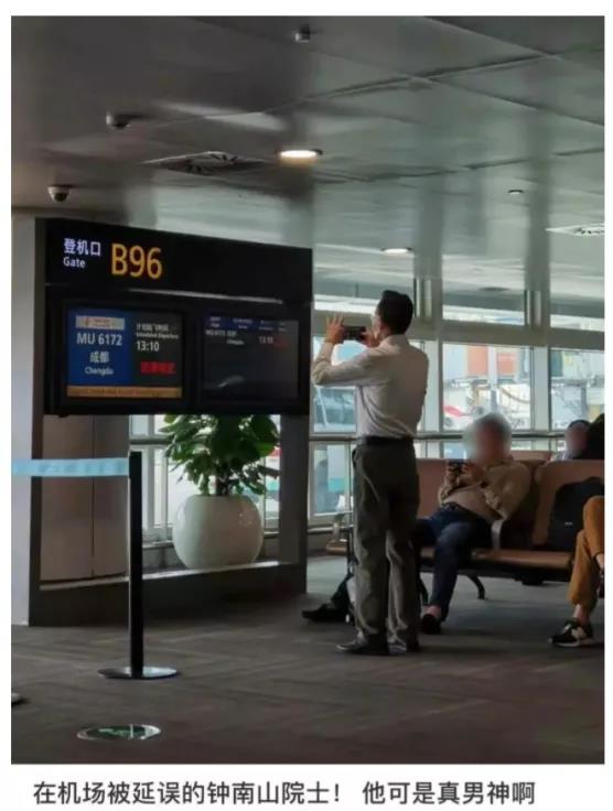 原来,是一位网友在机场候机时,遇到了同样因飞机延误的钟南山院士。当时钟南山院士正在用手机拍摄机场信息牌上的航班内容。就是这一幕被网友抓拍到了。