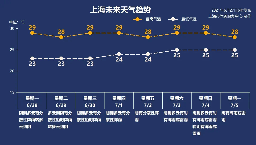 6月28日,周一:阴到多云有阵雨 23-29 ℃