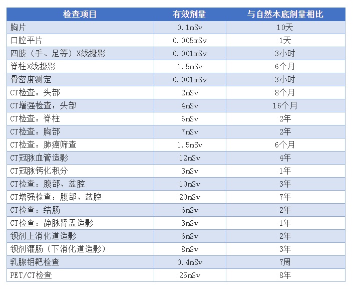 如1次胸片检查,平均有效剂量是0.1mSv,相当于10天的自然本底辐射剂量(生活环境中存在的天然射线的照射)。