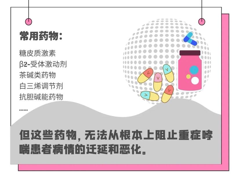 尽管应用了足量吸入性糖皮质激素和支气管舒张剂治疗,重度哮喘患者仍难以有效控制哮喘症状,其急诊就诊率和住院频率分别为轻中度哮喘的15倍和20倍,是哮喘治疗费用增加和哮喘致残、致死的主要原因。
