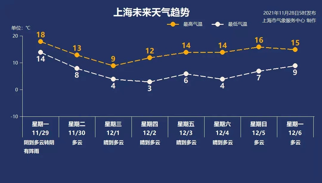 11月29日,周一:阴到多云转阴有阵雨 14-18 ℃