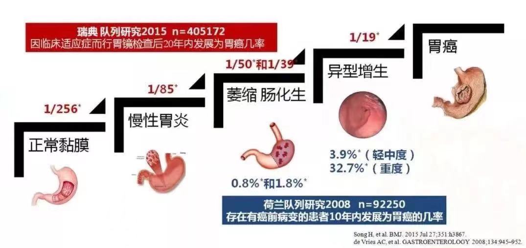 然而,但从“胃炎”到“胃癌”,其实就像过马路连续闯了红灯,并非遥不可及。癌症的形成犹如冰冻三尺,非一日之寒。如果不及时干预,治疗阻断,其实,“胃炎”变“胃癌”一共也就四步,大概也就10-15年!