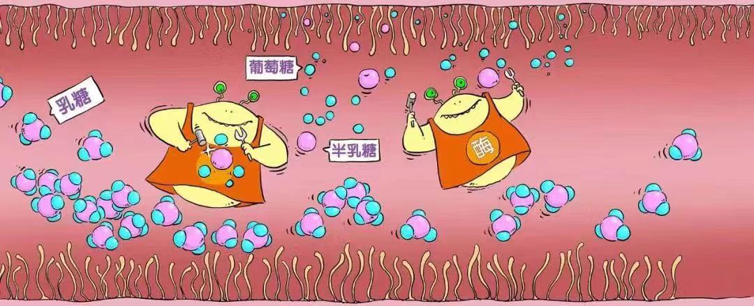 乳糖不耐受人群的小肠“停产”或“不产”乳糖酶,当大量牛奶进入小肠后,仅有的乳糖酶会勤勤恳恳地将牛奶中的乳糖分解成葡萄糖和半乳糖。