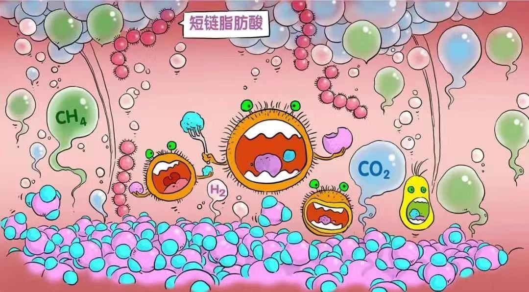 大肠中有很多细菌,一见到乳糖就两眼放光,立刻冲上前饱餐一顿,产生甲烷、二氧化碳、氢气等气体以及短链脂肪酸(醋酸、丙酸、丁酸、酮、醛等)。