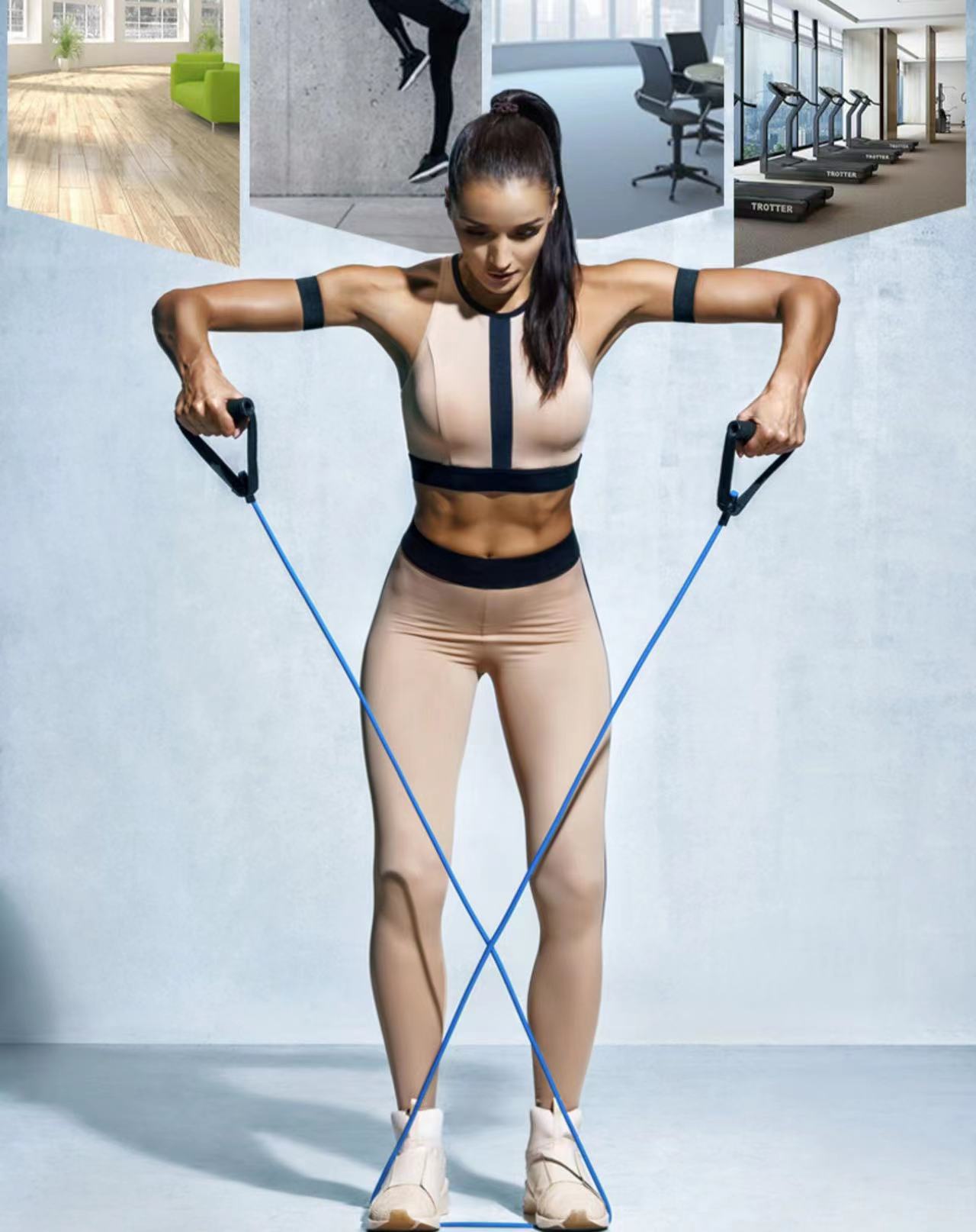 弹力绳既没有占地面积,又很便宜,通过脚踩弹力绳下蹲,模拟划船机运动,既可以锻炼腿部臀部肌肉还能锻炼背阔肌,侧拉同样可以紧致女生最讨厌的拜拜肉部位,上班间隙随时可以锻炼。