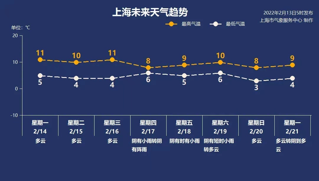 本周一阳光终于回归,周二周三维持多云的天气,晴好天气会持续3天左右,周二元宵节观灯赏月,周四起阴雨又会来袭,好在雨势不会太大,周日天气转好。近期冷空气势力较弱,气温平稳,最低气温3~6℃ ,最高气温8~11℃