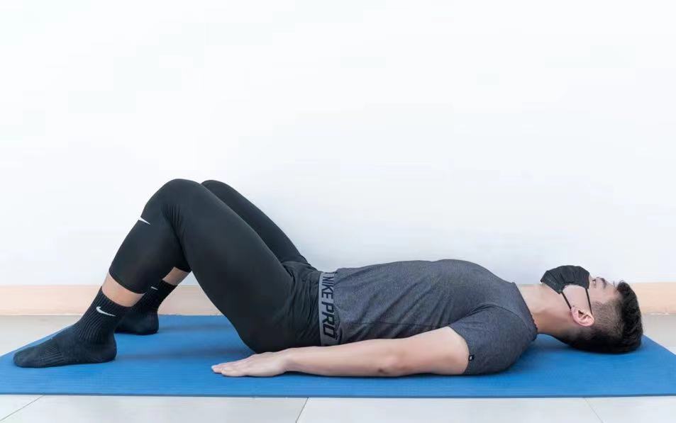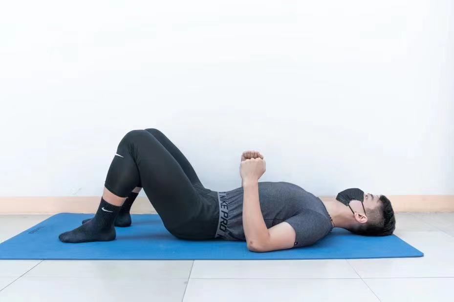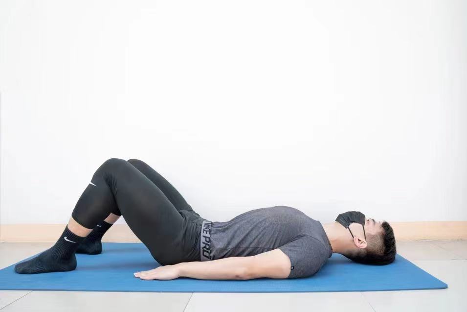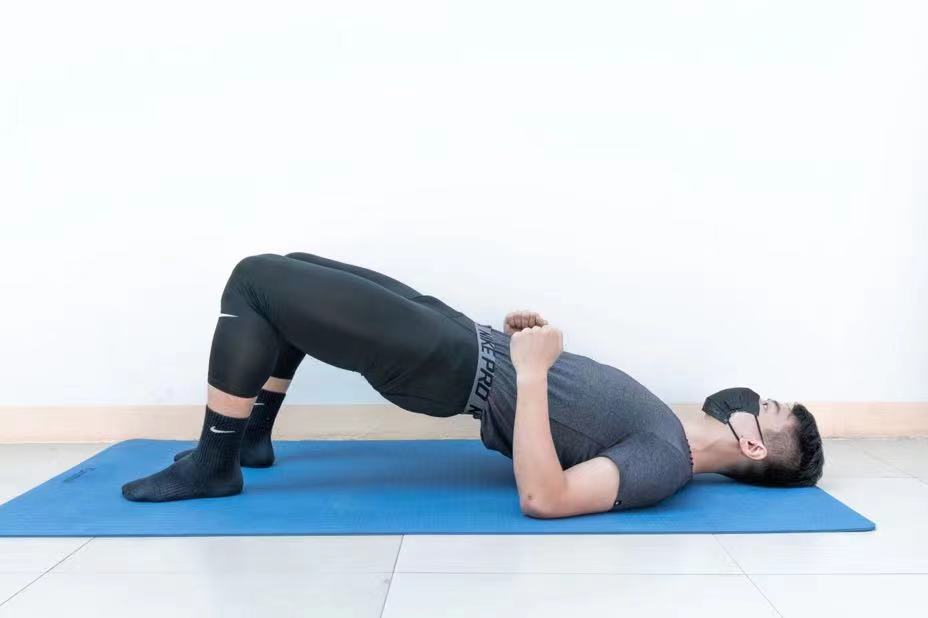 平躺于地垫上,双膝屈曲,双脚分开一肩宽,以双侧足跟、手肘及头部为支撑点,缓慢抬起臀部,尽量让肩、髋、膝呈一条直线,感受腰背部及臀部共同发力,也要注意臀部不要抬得太高,保持5秒钟,缓慢放下,重复15-20次为一组。