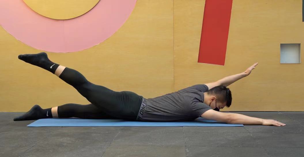 俯卧于地垫上,双脚自然分开,双手臂向前伸,抬起左手及右腿,头颈部根据动作略微抬起,注意不要过度低头及后仰,保持2秒钟后换另一侧,完成一次交替,如此交替20次为一组。