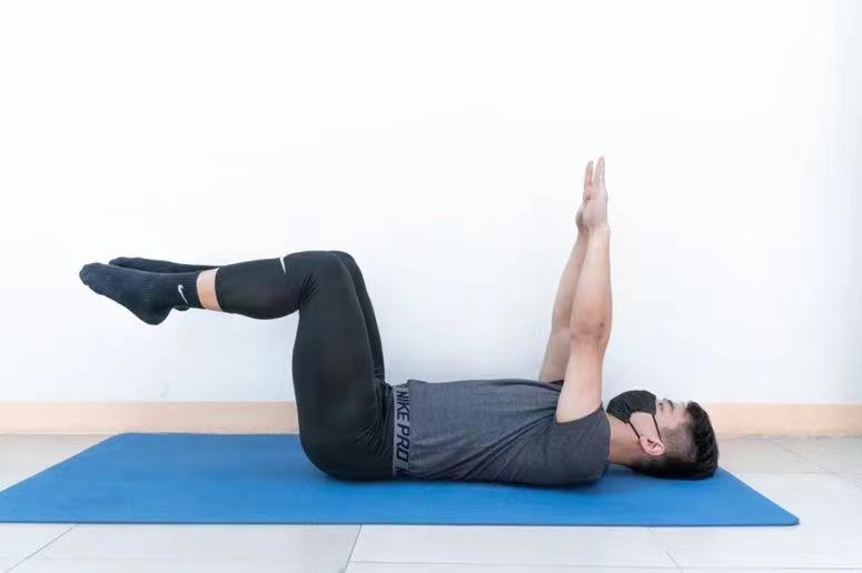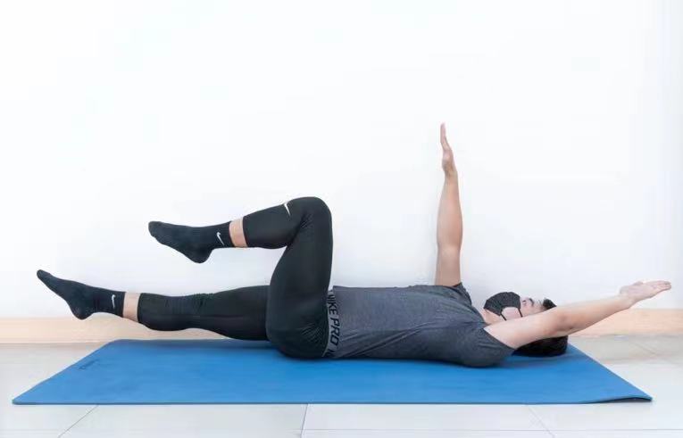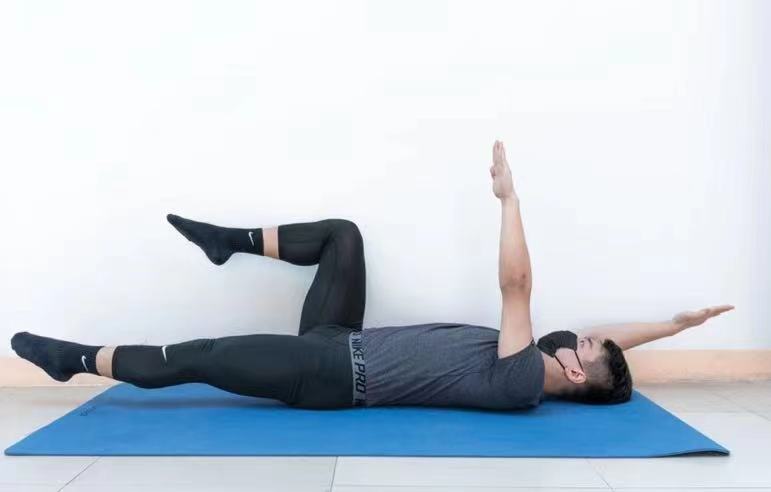 平躺于地垫上,双手伸直抬起,双腿屈膝抬起,背部尽量贴紧垫子,向后伸直放下左臂,同时缓慢伸直右腿放下,恢复原姿势后换边,动作过程中保持躯干稳定不摆动,感受腹部及腰背部肌肉的发力,交替20次为一组。