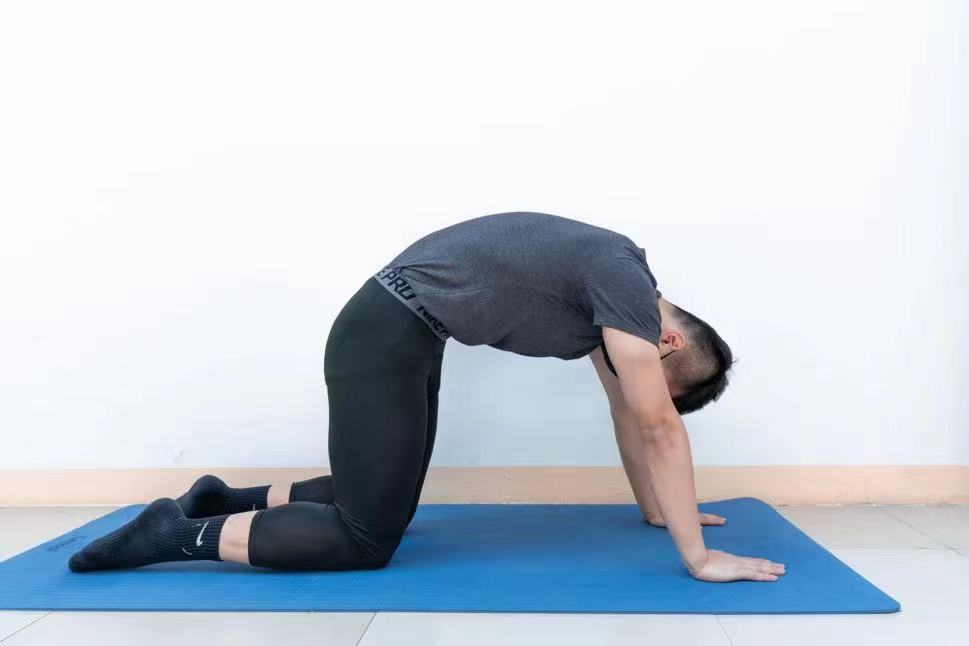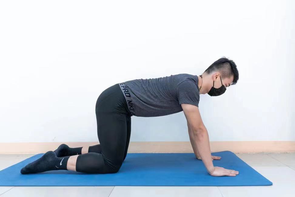跪姿于地垫上,双脚自然分开,双手撑地,缓缓吸气,同时背部拱起,再缓缓吐气,身体回到原来的位置,用力收紧腹部,感觉肚脐向上贴近背部,每一次呼吸尽量不少于10秒钟,重复15次为一组。